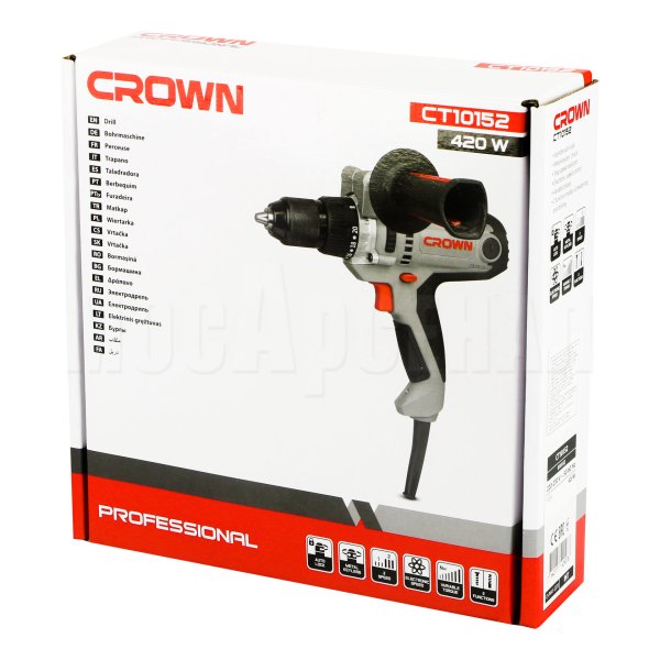 Мощная сетевая дрель-шуруповерт Crown CT10152, с металлическим корпусом редуктора и со стальным быстрозажимным сверлильным патроном.