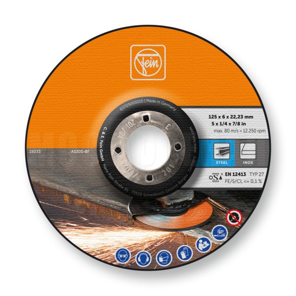 Для обдирочного шлифования и обработки сварного шва с хорошей стойкостью. Универсально используется для стали и высококачественной стали. Форма с уступом, внутренний диаметр 22,23 мм, максимальная скорость вращения 12 250 об/мин, максимальная рабочая скорость 80 м/с.