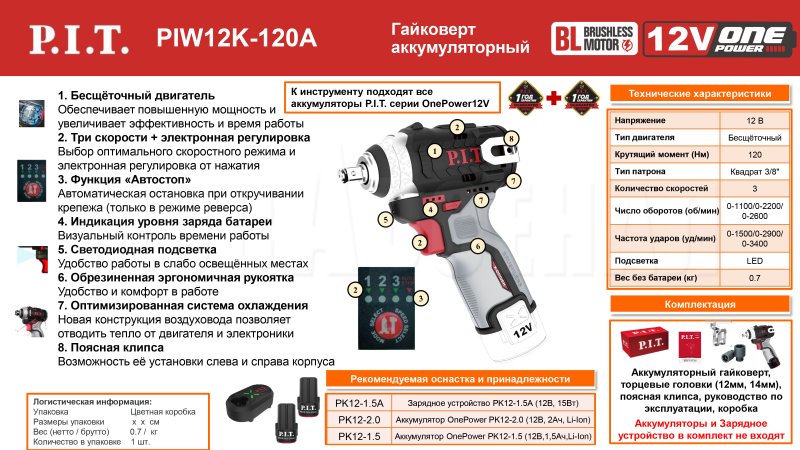 Аккумуляторный ударный гайковерт PIW12K-120A входит в семейство инструментов на единой аккумуляторной системе OnePower 12V. Аккумуляторы этой серии надежно защищены от перегрузок, перегрева и саморазряда. При этом быстро заряжаются и обеспечивают стабильную работу на все время использования.