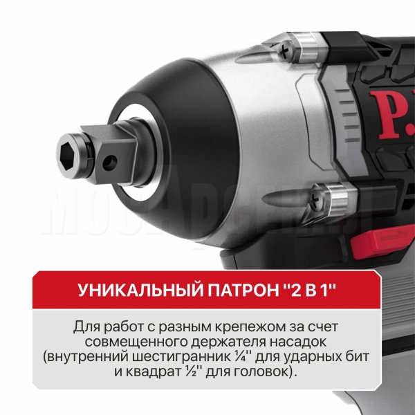 - Уникальный патрон "2в1" для работ с разным крепежом за счет совмещенного держателя насадок (внутренний шестигранник ¼'' для ударных бит и квадрат ½'' для головок).