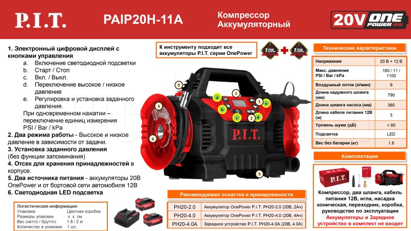 Аккумуляторный компрессор PAIP20H-11A может работать как от батареи 20В семейства OnePower, так и от прикуривателя автомобиля 12В. Данное устройство оснащено насосом низкого давления для надувания и сдувания лодок и матрасов, а также насосом высокого давления для подкачки мячей и шин.