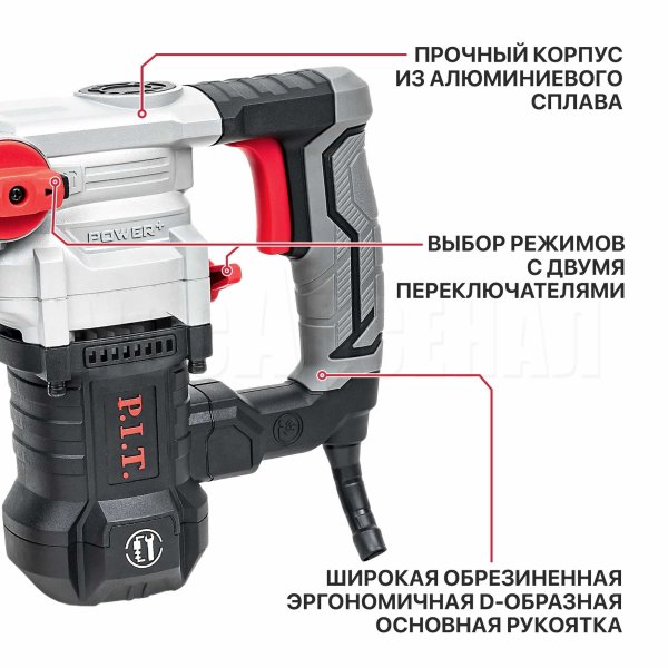 Эргономичная обрезиненная D-образная рукоятка с большим выключателем для комфортной работы и система SDS-Plus для быстрой смены оснастки.