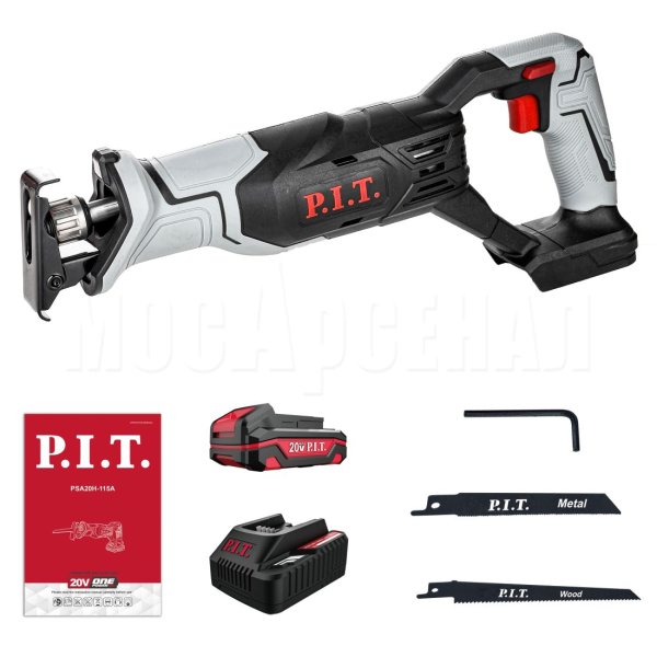 Сабельная пила, коробка, пильное полотно по дереву, пильное полотно по металлу, ключ шестигранный, аккумулятор, зарядное устройство, руководство по эксплуатации