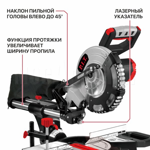 Две параллельные скользящие направляющие обеспечивают возможность поперечного перемещения пильной головы и позволяют работать с широкими заготовками и, в сочетании с ограничителем глубины пропила, распиловку "в полдерева".