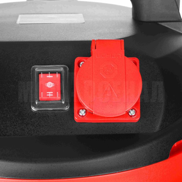 Пылесос оснащен встроенной розеткой с возможностью синхронной работы с подключённым инструментом.