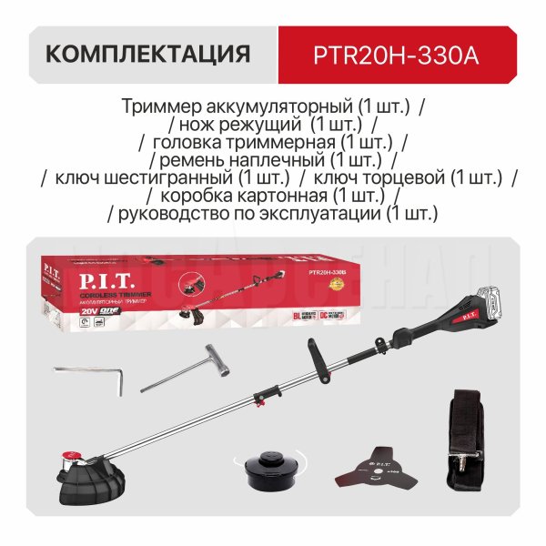 | Триммер аккумуляторный, режущий диск, триммерная головка, ремень наплечный, ключ шестигранный (2 шт), ключ торцевой, руководство по эксплуатации, коробка | |