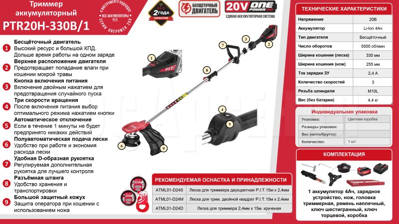 Аккумуляторный триммер PTR20H-330B/1 входит в семейство инструментов единой аккумуляторной системы OnePower20V. Аккумуляторы этой серии имеют защиту от перегрузок, перегрева и глубокого разряда. Благодаря Li-Ion технологии практически отсутствует саморазряд. К инструменту подходят все аккумуляторы серии OnePower20V