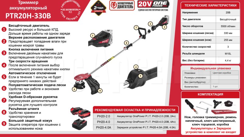 Аккумуляторный триммер PTR20H-330B входит в семейство инструментов единой аккумуляторной системы OnePower20V. Аккумуляторы этой серии имеют защиту от перегрузок, перегрева и глубокого разряда. Благодаря Li-Ion технологии практически отсутствует саморазряд. К инструменту подходят все аккумуляторы серии OnePower20V