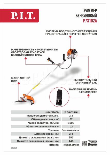 Бензиновый триммер P73102A — надежный помощник в борьбе с высокой травой как на малых, так и на больших приусадебных участках. Маневренный и мобильный инструмент, подходит для работы на неровных поверхностях и кошения травы разной высоты.