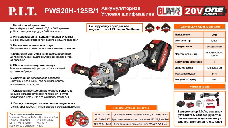Аккумуляторная угловая шлифмашина PWS20H-125B/1 входит в семейство инструментов единой аккумуляторной системы OnePower20V. К инструменту подходят все аккумуляторы системы OnePower20V