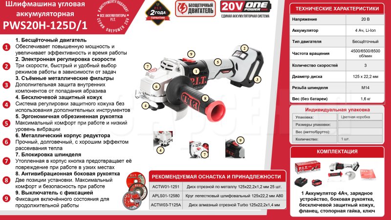 Аккумуляторная угловая шлифмашина PWS20H-125D/1 входит в семейство инструментов единой аккумуляторной системы OnePower20V. К инструменту подходят все аккумуляторы системы OnePower20V