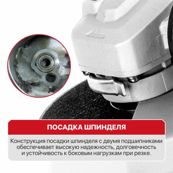 Конструкция посадки шпинделя с двумя подшипниками обеспечивает высокую надежность, долговечность и устойчивость к боковым нагрузкам при резке.
