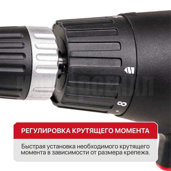 Регулировка крутящего момента и функция реверса позволяет использовать инструмент в качестве шуруповерта и подобрать оптимальное усилие для работы с крепежом разного размера.