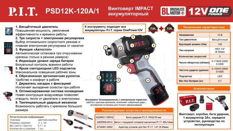 Аккумуляторный ударный винтоверт PSD12K-120A/1 входит в семейство инструментов на единой аккумуляторной системе OnePower 12V. Аккумуляторы этой серии надежно защищены от перегрузок, перегрева и саморазряда. При этом быстро заряжаются и обеспечивают стабильную работу на все время использования.
