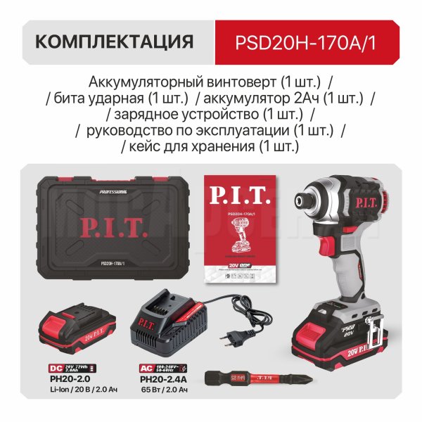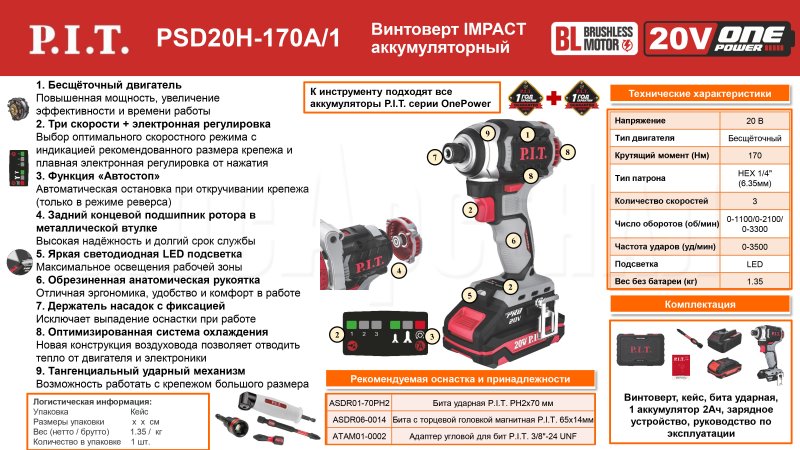 Аккумуляторный ударный винтоверт PSD20H-170A/1 входит в семейство инструментов на единой аккумуляторной системе OnePower 20V. Аккумуляторы этой серии надежно защищены от перегрузок, перегрева и саморазряда. При этом быстро заряжаются и обеспечивают стабильную работу на все время использования.