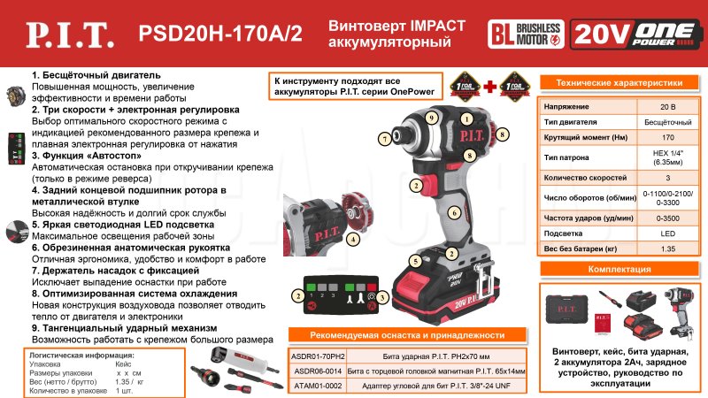 Аккумуляторный ударный винтоверт PSD20H-170A/2 входит в семейство инструментов на единой аккумуляторной системе OnePower 20V. Аккумуляторы этой серии надежно защищены от перегрузок, перегрева и саморазряда. При этом быстро заряжаются и обеспечивают стабильную работу на все время использования.
