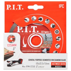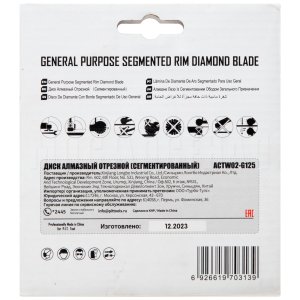 Диск алмазный сегментный ACTW02-G125 - универсальный алмазный диск общего назначения, предназначен для использования с угловыми шлифовальными машинами и может применяется для резки бетона, природного камня, бордюрного камня, кирпича, цементных блоков, тротуарной плитки и т.п.