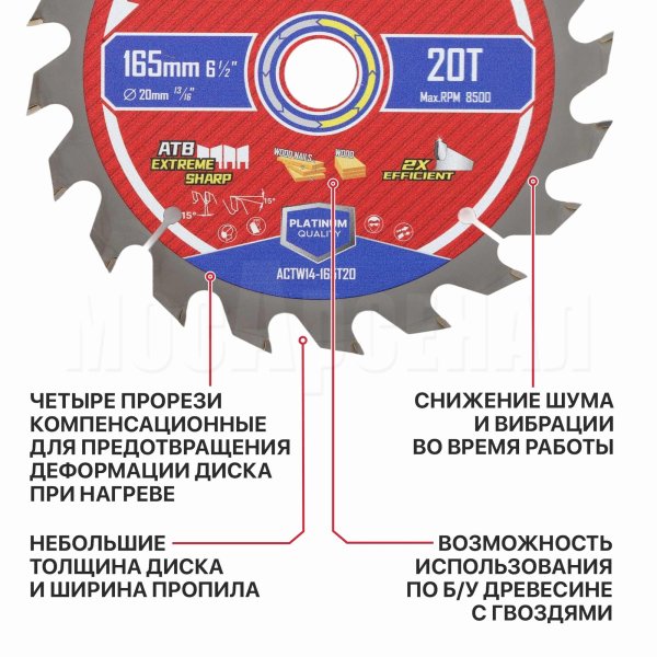 Диск пильный с твердосплавными напайками по дереву для циркулярных и торцовочных пил ACTW14-165T20 отличный вариант для распила древесины, досок, многослойных плит, древесностружечных плит (ДСП, OSB, фанеры и т.д.).