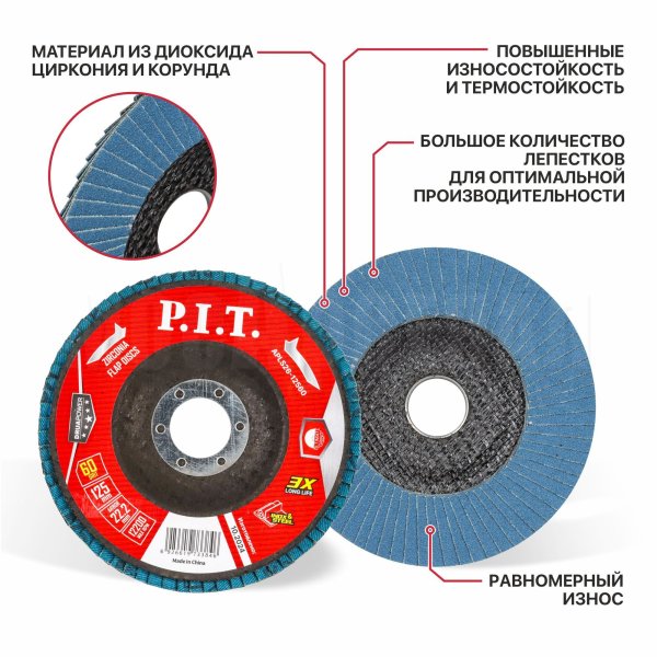 Лепестки равномерно распределены в форме веера, обладают высокой режущей способностью, термостойкостью и износостойкостью. Равномерный износ лепестков предотвращает "засаливание" и обеспечивает качественную обработку на протяжении всего срока службы.