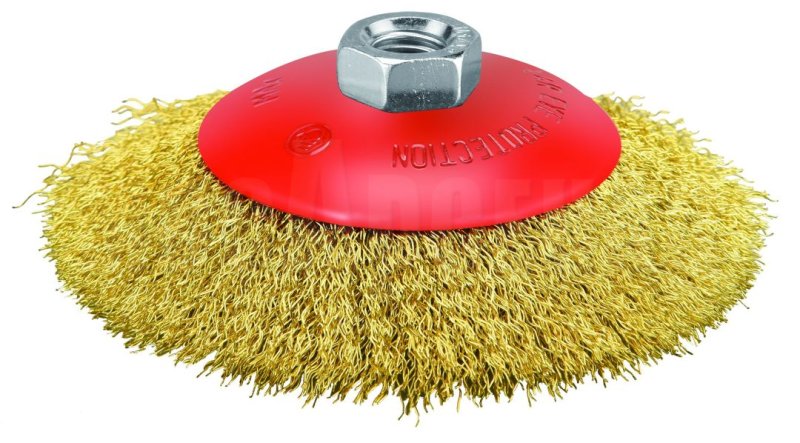 Коническая кордщетка со стальной витой латунированной проволокой. Подходит для щадящей обработки и зачистки поверхностей, удаления ржавчины, грязи, краски и лаков, а также для получения необходимой шероховатости. Чашеобразная форма и большой диаметр позволяют производить обработку больших поверхностей.