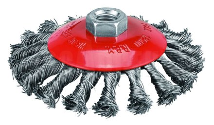 Коническая кордщетка с витой проволокой из высокопрочной стали предназначена для использования с угловыми шлифовальными машинами для зачистки металлических поверхностей, удаления покрытий, краски, ржавчины, следов сварки, обработки узких кромок, рам и решеток.