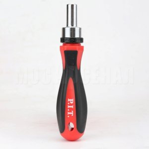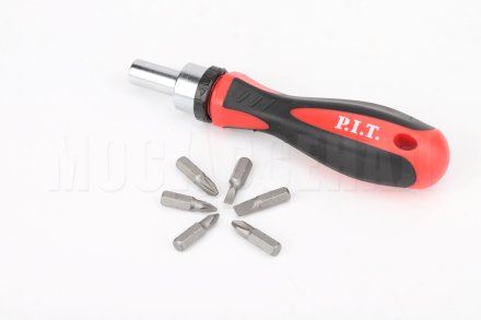 Рукоятка-держатель бит оснащена трещоткой, что позволяет выбрать нужное направление вращения и облегчает работу, а также встроенным магнитом для фиксации бит.