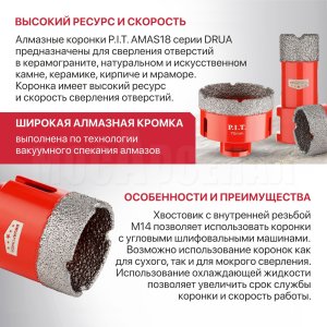 Алмазные коронки P.I.T. AMAS18 серии DRUA предназначены для сверления отверстий в керамограните, натуральном и искусственном камне, керамике, кирпиче и мраморе. Благодаря широкой алмазной кромке, выполненной по технологии вакуумного спекания алмазов, коронка имеет высокий ресурс и скорость сверления отверстий в материале. Хвостовик с внутренней резьбой M14 позволяет использовать коронки с угловыми шлифовальными машинами. Возможно использование коронок как для сухого, так и для мокрого сверления. Использование охлаждающей жидкости позволяет увеличить срок службы коронки и скорость работы.