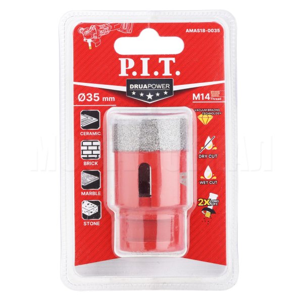 Алмазные коронки P.I.T. AMAS18 серии DRUA предназначены для сверления отверстий в керамограните, натуральном и искусственном камне, керамике, кирпиче и мраморе.