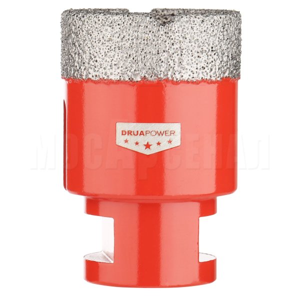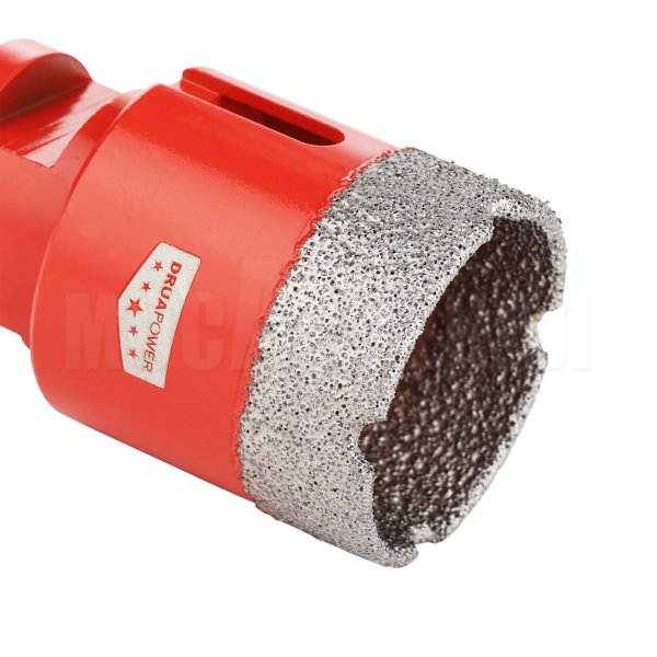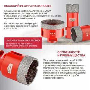 Алмазные коронки P.I.T. AMAS18 серии DRUA предназначены для сверления отверстий в керамограните, натуральном и искусственном камне, керамике, кирпиче и мраморе. Благодаря широкой алмазной кромке, выполненной по технологии вакуумного спекания алмазов, коронка имеет высокий ресурс и скорость сверления отверстий в материале. Хвостовик с внутренней резьбой M14 позволяет использовать коронки с угловыми шлифовальными машинами. Возможно использование коронок как для сухого, так и для мокрого сверления. Использование охлаждающей жидкости позволяет увеличить срок службы коронки и скорость работы.