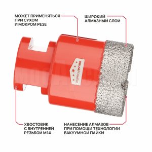 Особенности и - Нанесение алмазов при помощи технологии вакуумной пайки - Широкий алмазный слой - Возможность использования при сухом и мокром сверлении - Хвостовик с внутренней резьбой М14