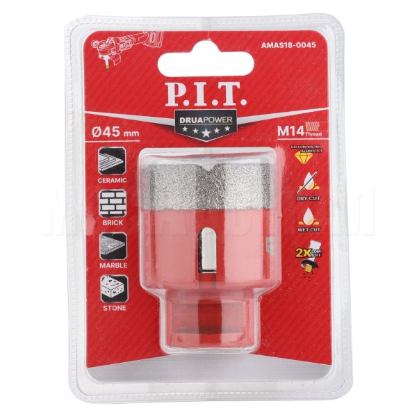 Алмазные коронки P.I.T. AMAS18 серии DRUA предназначены для сверления отверстий в керамограните, натуральном и искусственном камне, керамике, кирпиче и мраморе.