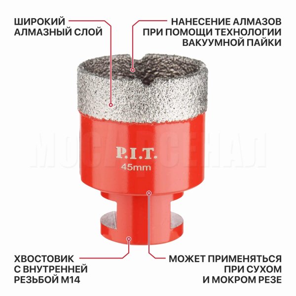 Хвостовик с внутренней резьбой M14 позволяет использовать коронки с угловыми шлифовальными машинами.