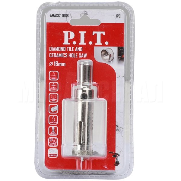 Коронка алмазная AMAS12-0016 - идеальный инструмент для просверливания отверстий в керамической плитке или стеклянных перегородках для монтажа оборудования, мебельных конструкций или прокладки коммуникаций.