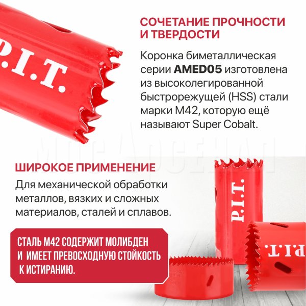 Коронка биметаллическая серии AMED05 изготовлена из высоколегированной быстрорежущей (HSS) стали марки М42, которую ещё называют Super Cobalt. В составе стали М42 также содержится молибден, что обеспечивает хорошее сочетание прочности и твердости.