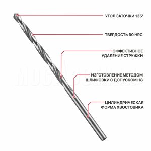 Сверла изготовлены из высококачественной быстрорежущей стали HSS 4241 с твердостью 60 HRC методом шлифовки, Позволяют обрабатывать черный металл, легированные и нелегированные стали и сплавы, цветные металлы.