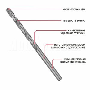 Сверла изготовлены из высококачественной быстрорежущей стали HSS 4241 с твердостью 60 HRC методом шлифовки, Позволяют обрабатывать черный металл, легированные и нелегированные стали и сплавы, цветные металлы.