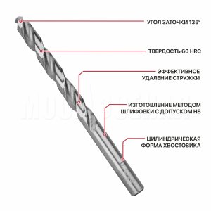 Сверла изготовлены из высококачественной быстрорежущей стали HSS 4241 с твердостью 60 HRC методом шлифовки, Позволяют обрабатывать черный металл, легированные и нелегированные стали и сплавы, цветные металлы.