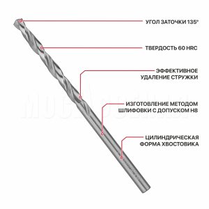 Острые и ровные режущие грани сверла обеспечивают чистые и ровные отверстия, а глубокая спираль - эффективное удаление стружки.