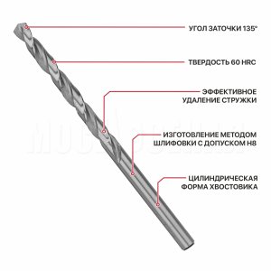 Сверла изготовлены из высококачественной быстрорежущей стали HSS 4241 с твердостью 60 HRC методом шлифовки, Позволяют обрабатывать черный металл, легированные и нелегированные стали и сплавы, цветные металлы.