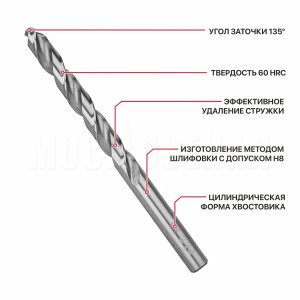 Сверла изготовлены из высококачественной быстрорежущей стали HSS 4241 с твердостью 60 HRC методом шлифовки, Позволяют обрабатывать черный металл, легированные и нелегированные стали и сплавы, цветные металлы.