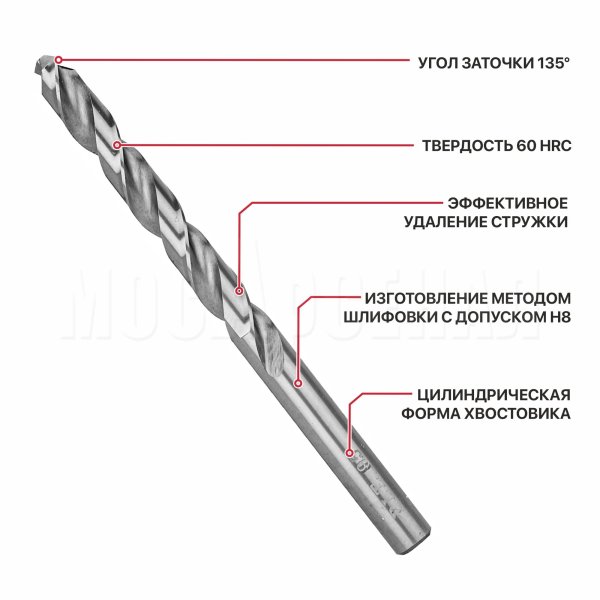 Сверла изготовлены из высококачественной быстрорежущей стали HSS 4241 с твердостью 60 HRC методом шлифовки, Позволяют обрабатывать черный металл, легированные и нелегированные стали и сплавы, цветные металлы.