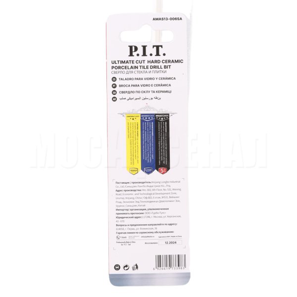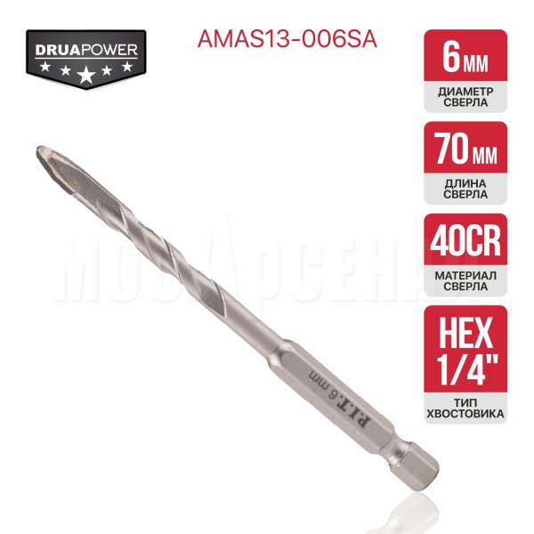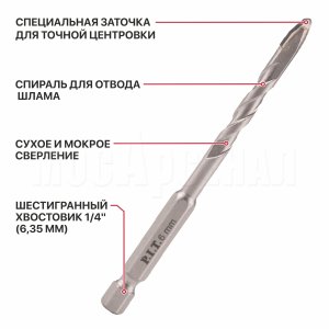 Сверло AMAS13-006SA для стекла, керамики, твердого керамического фарфора и мрамора, не требующее обязательного охлаждения при сверлении. Специальная заточка наконечника позволяет точно центрировать сверло и обеспечивает чистоту краев отверстий.