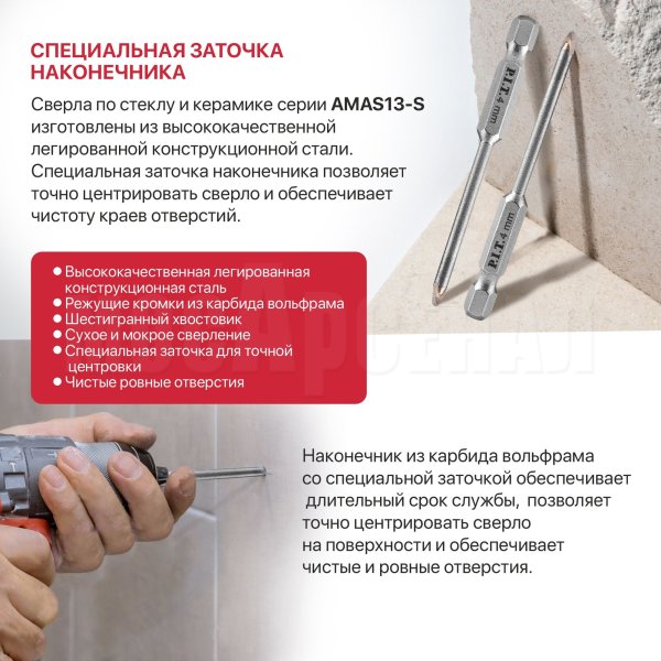 Сверла по стеклу и керамике серии AMAS13-S изготовлены из высококачественной легированной конструкционной стали. Специальная заточка наконечника позволяет точно центрировать сверло и обеспечивает чистоту краев отверстий.