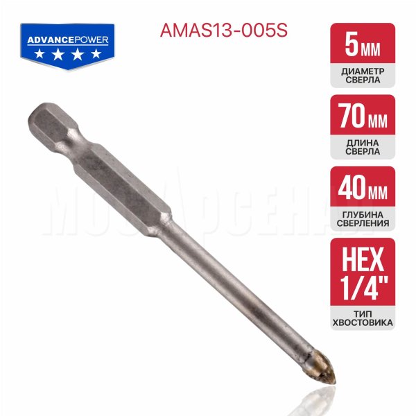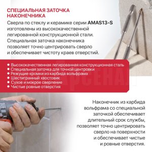 Сверла по стеклу и керамике серии AMAS13-S изготовлены из высококачественной легированной конструкционной стали. Специальная заточка наконечника позволяет точно центрировать сверло и обеспечивает чистоту краев отверстий.