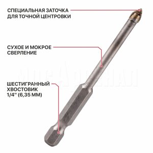 Наконечник из карбида вольфрама со специальной заточкой обеспечивает длительный срок службы, позволяет точно центрировать сверло на поверхности и обеспечивает чистые и ровные отверстия.