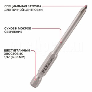 Наконечник из карбида вольфрама со специальной заточкой обеспечивает длительный срок службы, позволяет точно центрировать сверло на поверхности и обеспечивает чистые и ровные отверстия.