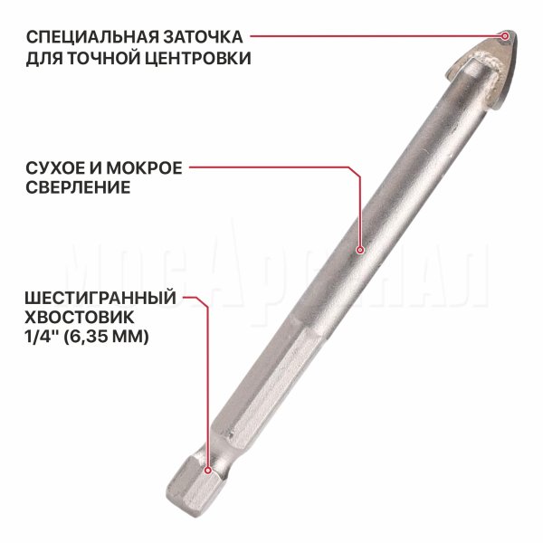 Наконечник из карбида вольфрама со специальной заточкой обеспечивает длительный срок службы, позволяет точно центрировать сверло на поверхности и обеспечивает чистые и ровные отверстия.