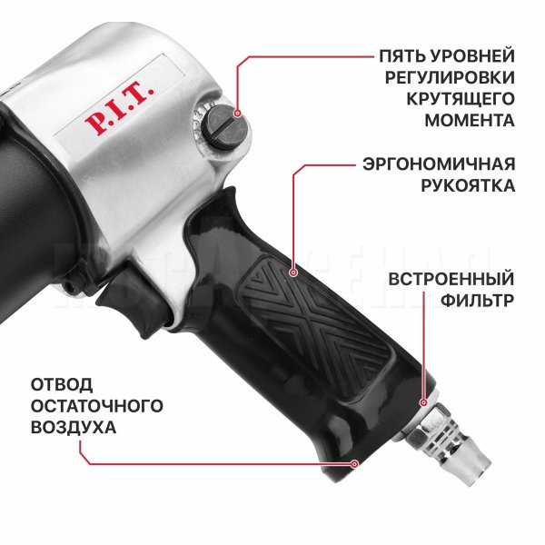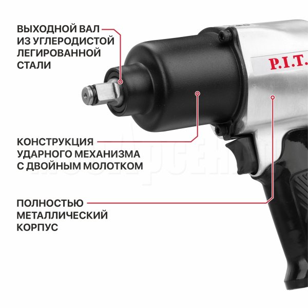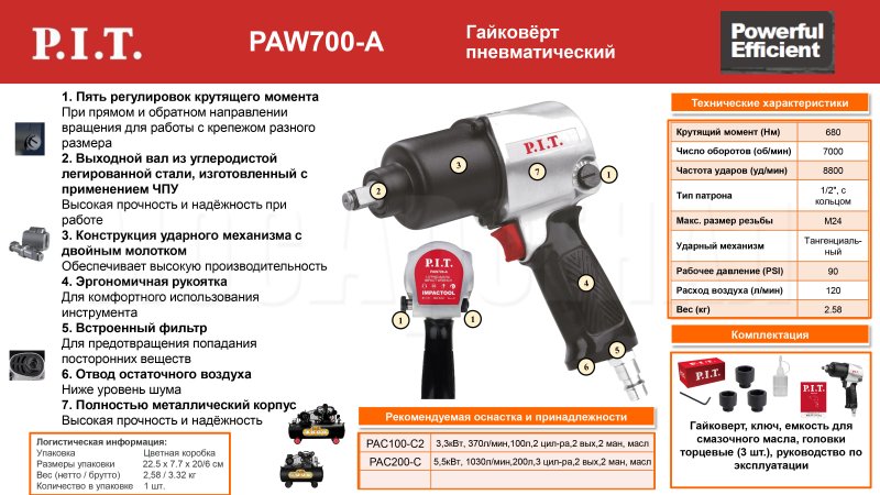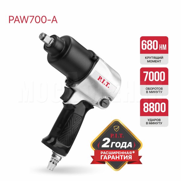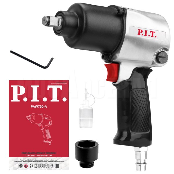 Пневмогайковерт PAW700-A — это инструмент для монтажа и демонтажа гаек и болтов. Изделие подойдет для применения в автосервисах и мастерских, так как производит быструю и точную работу. Пневмогайковерт работает за счет сжатого воздуха, который поступает от компрессора через шланг. Посадочный квадрат 1/2"
