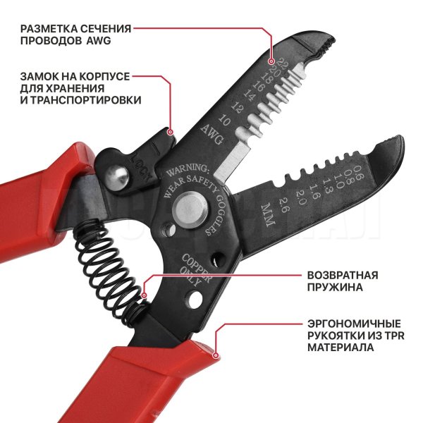 Острые режущие кромки позволяют легко снимать изоляцию с проводов или перекусывать их.