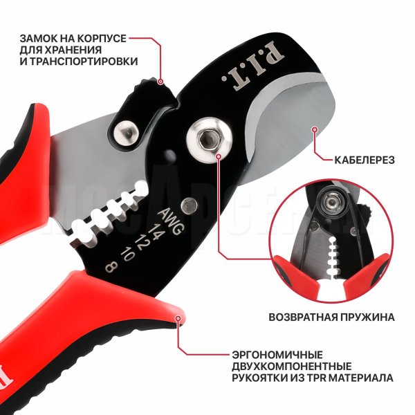Острые режущие кромки позволяют легко снимать изоляцию с проводов, а кабелерез обеспечивает возможность перекусывания проводов и кабелей большого диаметра.